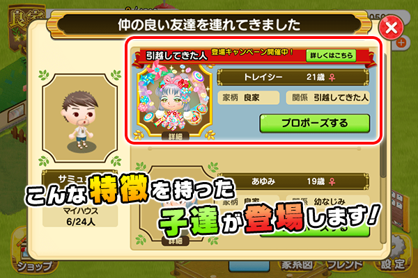 キャンペーン期間中は、仲の良い友達を連れてきた時、新しい特徴を持った『引越してきた人』を必ず連れてきます。